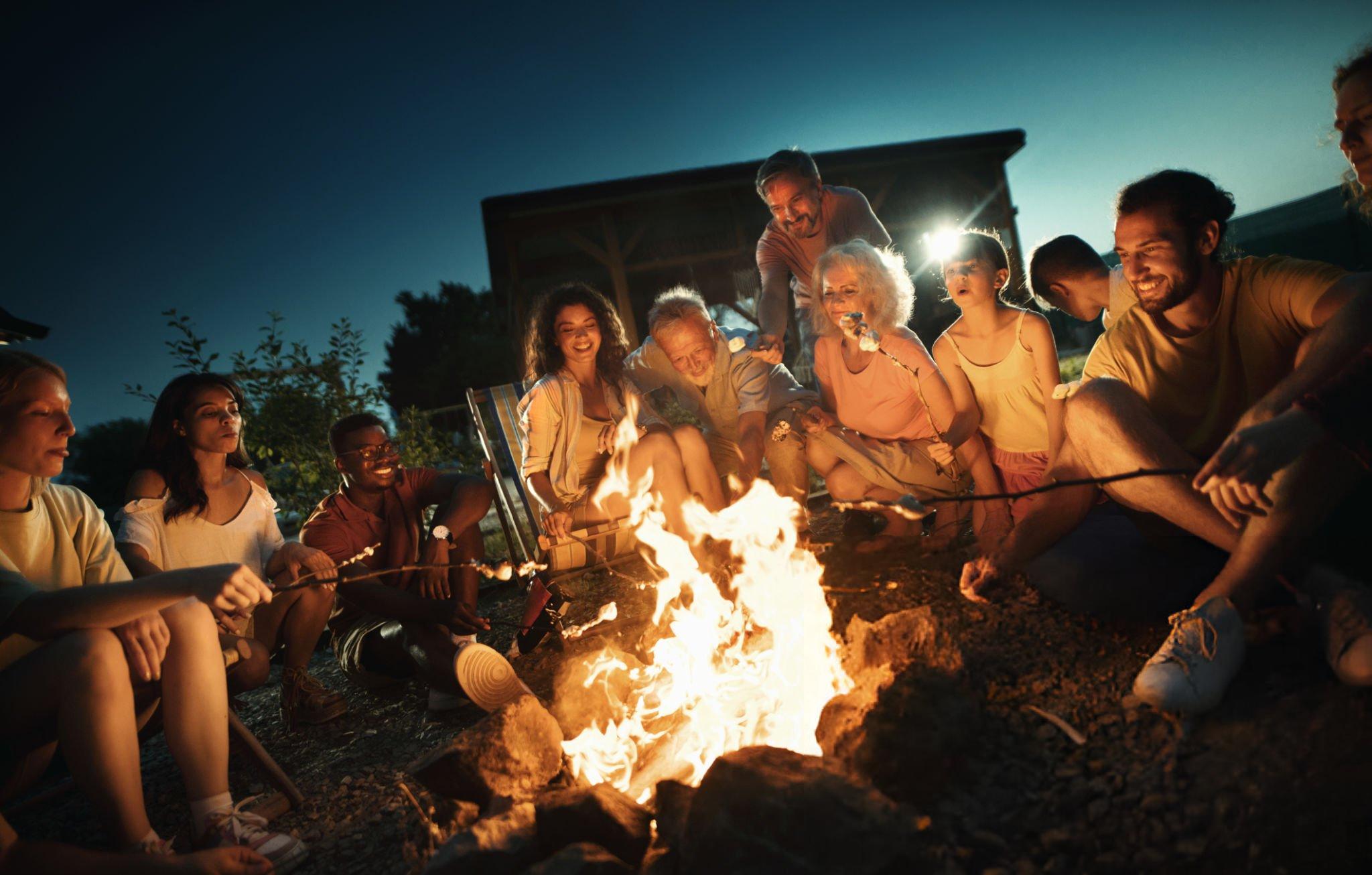 As the sun sets over the hills, guests gather around a glowing campfire to enjoy an evening of warmth, storytelling and delicious outdoor grilling.