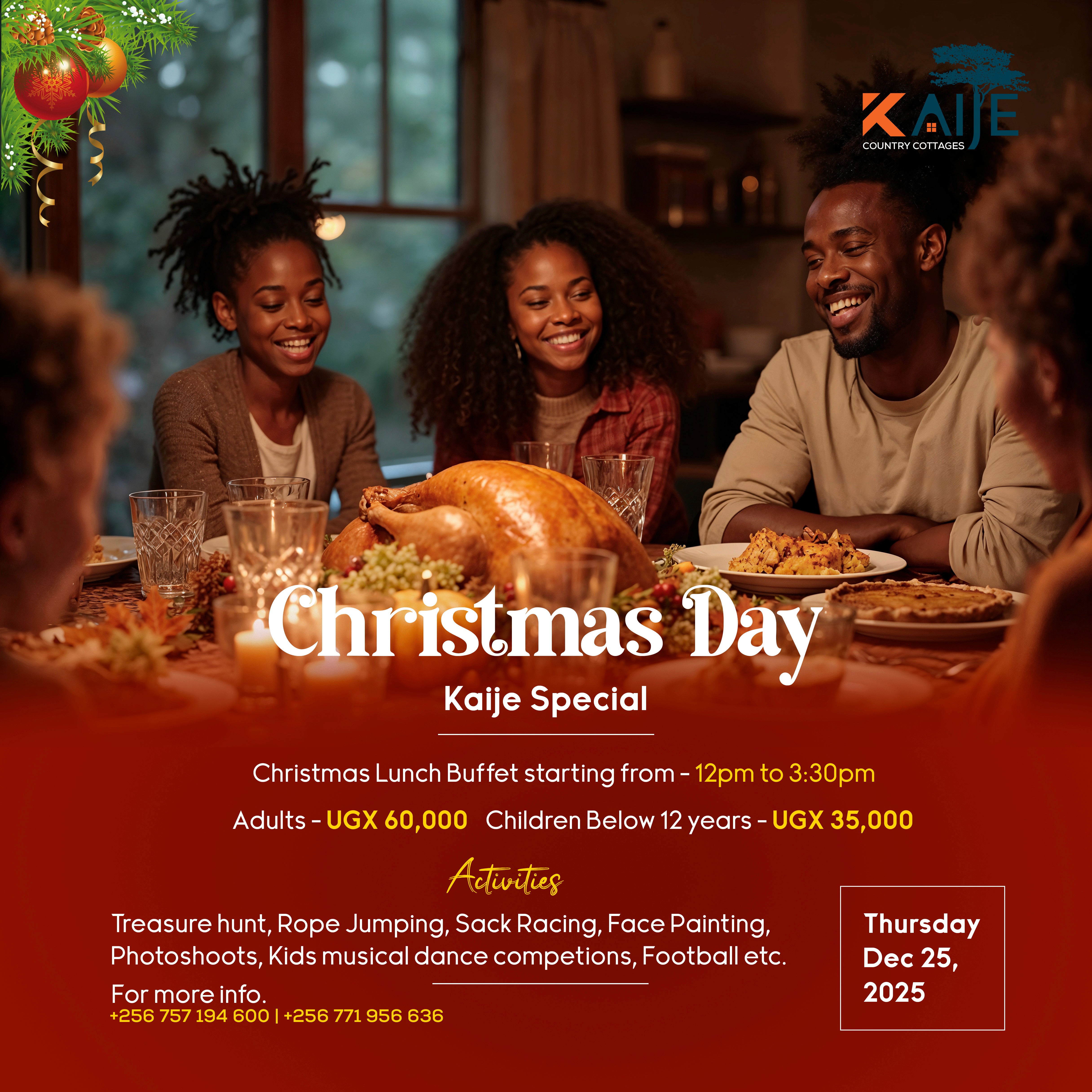 Celebrate this festive season with a warm and delicious Christmas Buffet surrounded by the natural charm of Kaije Country Cottages. Enjoy a generous spread of holiday favorites, live grilling, and a cozy atmosphere perfect for families, friends, and loved ones. 💰 Charges: Adults: 60,000 UGX Kids (Under 12 years): 35,000 UGX Bring your appetite and your holiday cheer — it’s a Christmas feast you won’t want to miss!