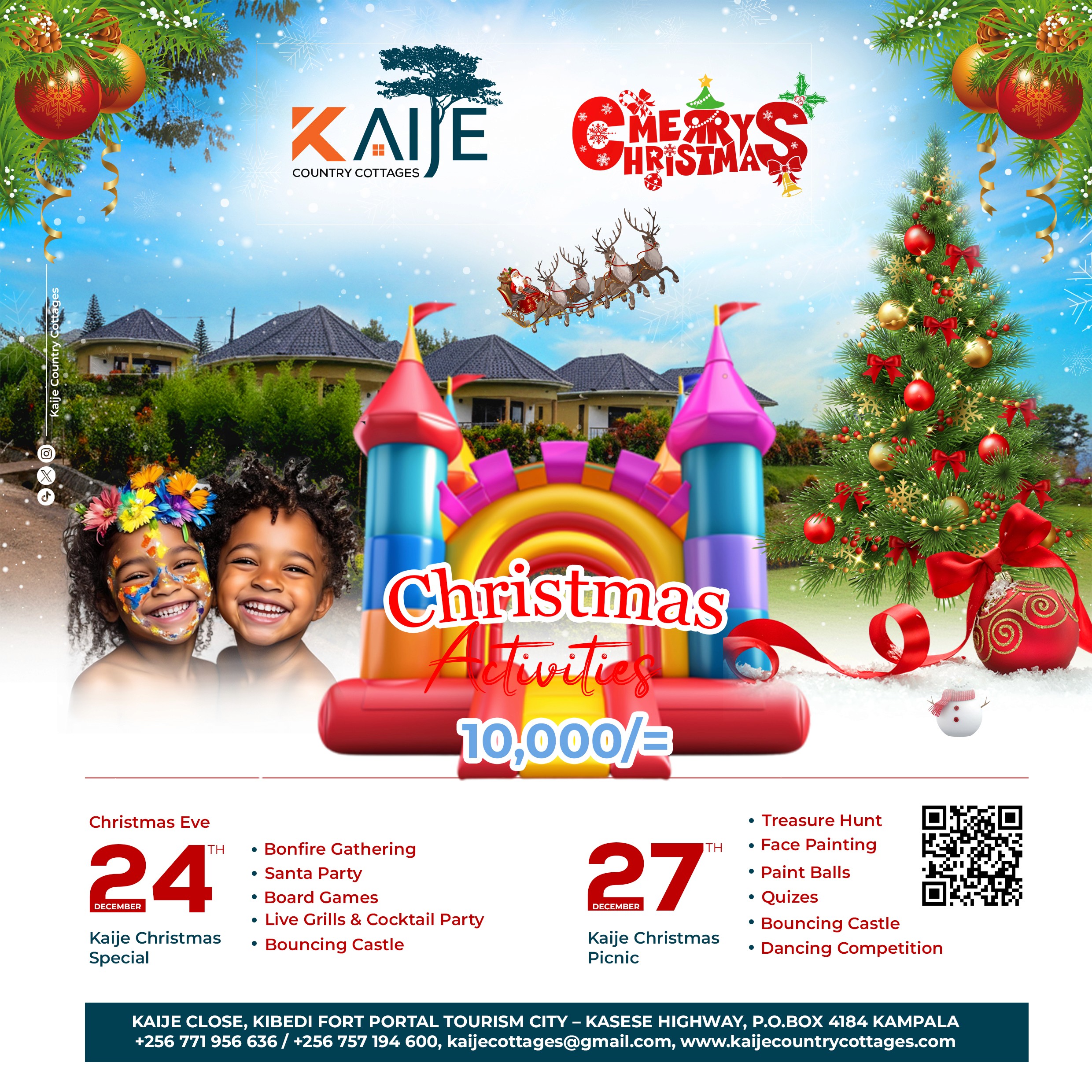 et the little ones enjoy the festive season with two special days filled with fun and excitement! From games and face painting to storytelling and holiday surprises, our Kids’ Christmas Fun Days are designed to keep children entertained and joyful throughout Christmas Eve and Christmas Day. 💰 Charges: Kids (All under 12 years): 10,000 UGX A perfect Christmas treat for the young ones — bring them to Kaije Country Cottages for two days of pure holiday magic!